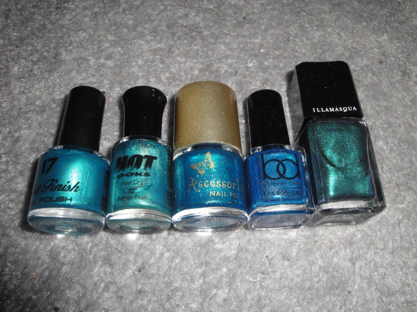 Left-Right: Boots 17 Fast Finish Peacock, Collection 2000 Hot Looks 37 Bongo Beat, Accessorize Illusions 39 Mermaid, Barbara Daly Aqua Shimmer, Illamasqua Viridian.
